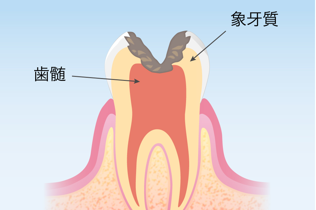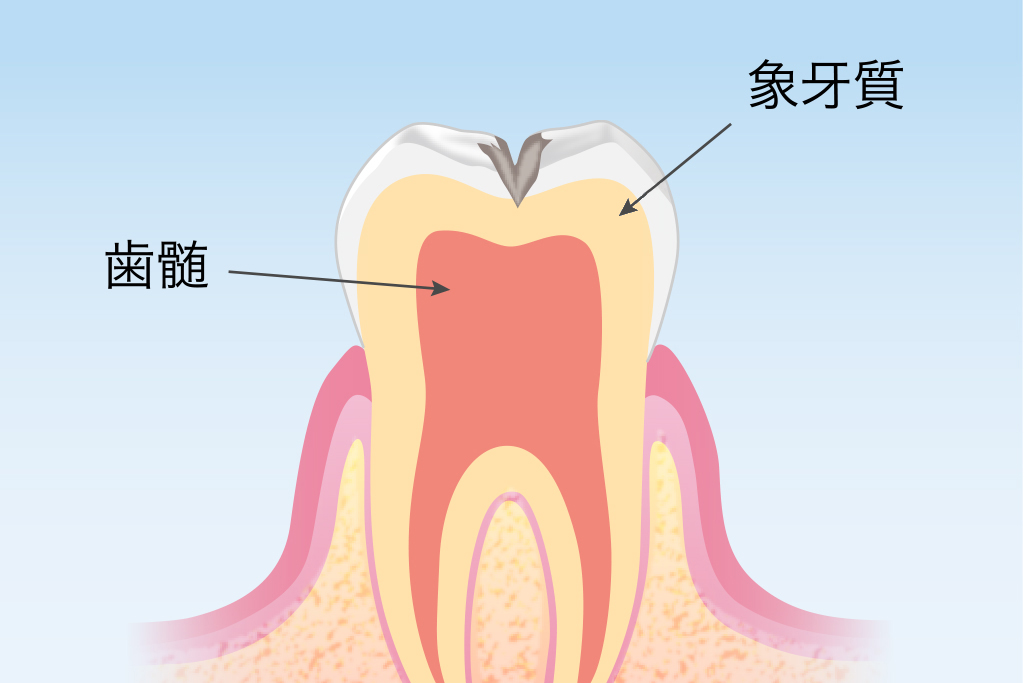 エナメル質を通過し、象牙質までむし歯が進行しています。